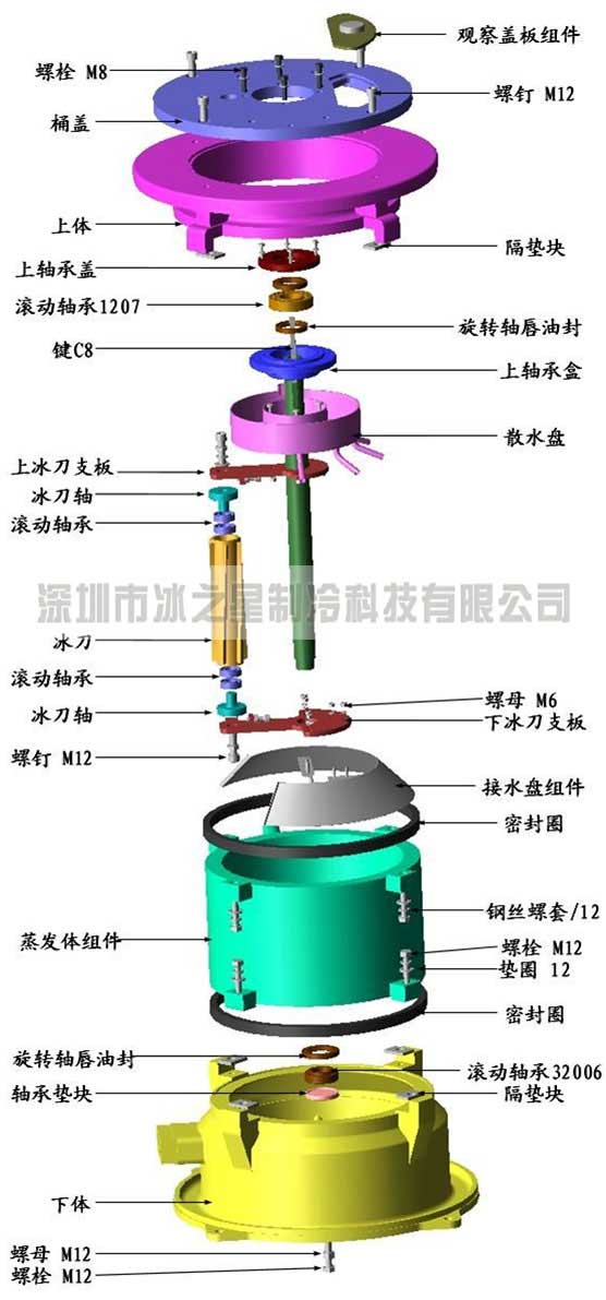 冰過程:當水經(jīng)過內(nèi)壁時,內(nèi)壁上會形成1-2mm厚的干燥冰,冰由冰刀掛下掉進冰柜;