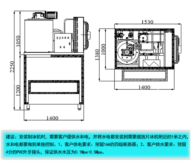 | 12 | 整機(jī)外型尺寸(長(zhǎng)*寬*高) | 1530*1380*2250 mm | 包含儲(chǔ)冰庫 |
