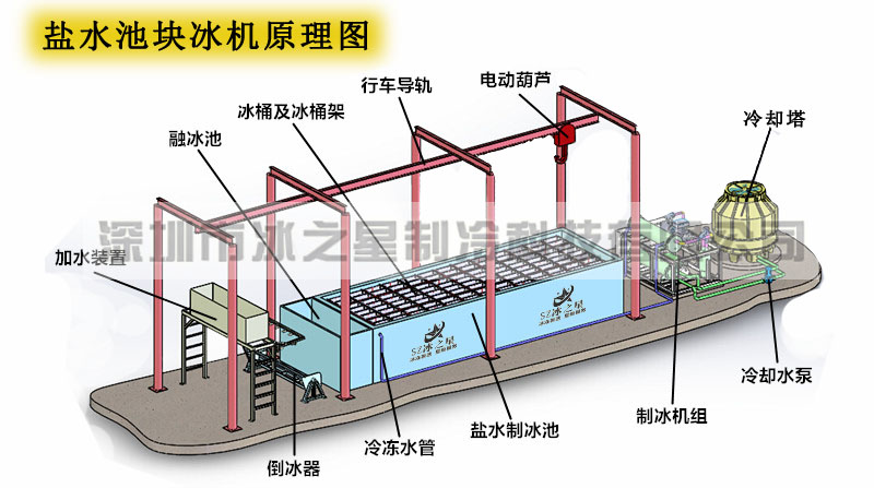 鹽水池塊冰機設備主要包括制冰機組、制冰鹽水池、冰桶及冰桶架、融冰池、倒冰架、加水器、吊冰車組成。