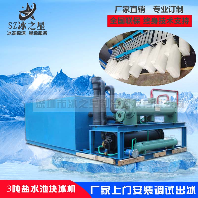 日產(chǎn)3噸鹽水池塊冰機介紹 深圳冰之星是國內(nèi)專業(yè)設(shè)計生產(chǎn)塊冰機冰磚機條冰機的廠家,可針對每個客戶要求(