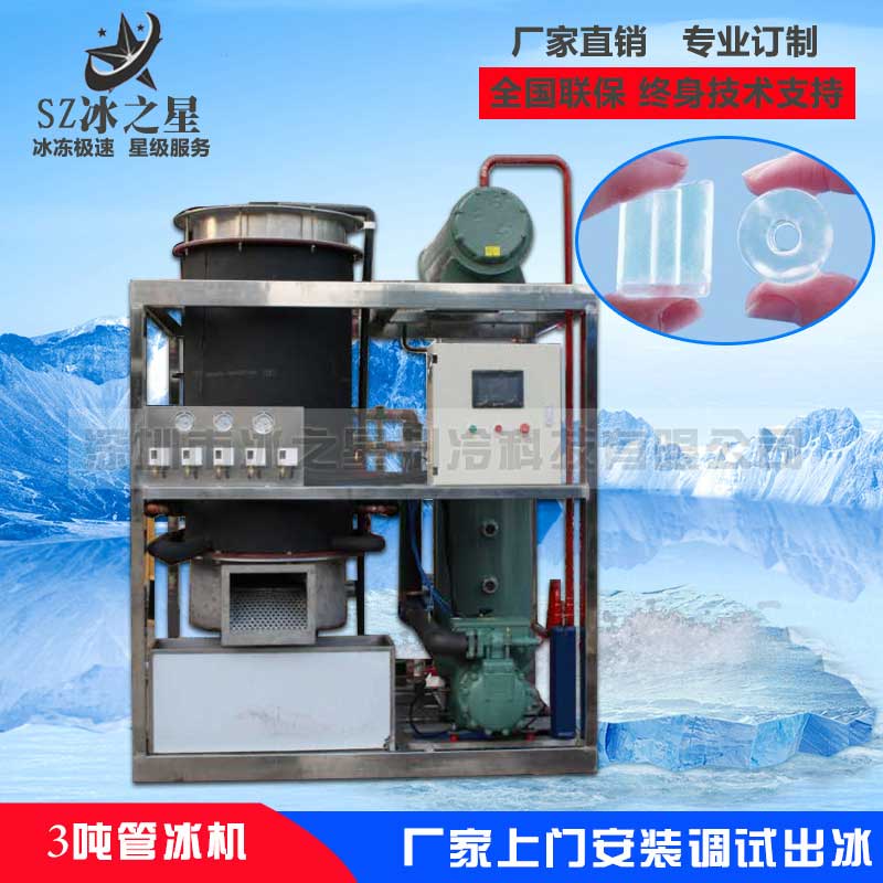 深圳冰之星3噸食用管冰機簡介: 管冰機為制冰機 的一種。因其冰塊形狀為中空管狀而得名,其內(nèi)孔徑在5mm~